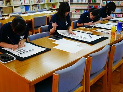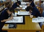 今回はテーマ「多胡碑を書く」の名のとおり、書道講座です。中国南北朝時代期を中心とする楷書の書風を伝える文字として書道の歴史の上でも大変著名な多胡碑。実際に筆をとっていただき、1300年前の古代東国の吉井の地にこの石碑を建てようとした当時の人々の様子に思いを馳せていただければと開催しました。この日は吉井高校図書館を書道室に変え、本校の芸術科書道担当の外処珠美教諭の指導のもと、本校書道部員もお手伝いしながら、一緒になって多胡碑に取り組みました。