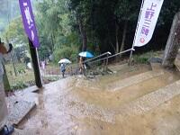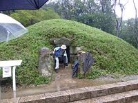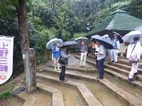 次いで山上碑に移動し、次第に雨が降り出すなか180段の石段を上り、碑の前で飯塚教頭の解説に耳を傾けるとともに、隣接する山上古墳の横穴式石室にも入り、加工した石材を精巧に組み上げた7世紀前半から半ばにかけての当時最先端の横穴式石室の構造を見ていただきました。