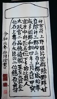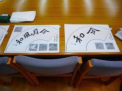 多胡碑文に慣れていただいた上で、いよいよ仕上げとして、真っ白な扇に、多胡碑文または改元となった今年にちなんで新元号「令和」や、典拠となった『万葉集』の「令月風和」の文字を清書したオリジナルの扇を作成していただきました。
