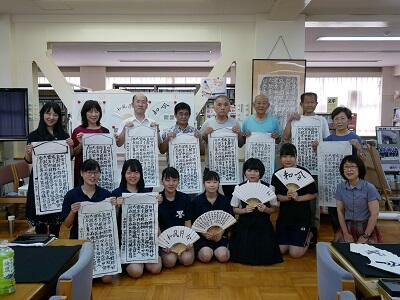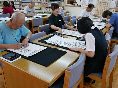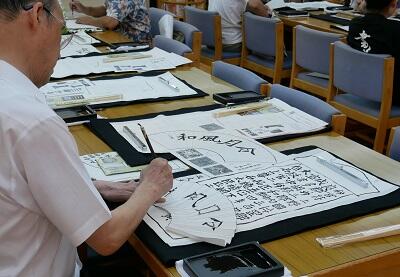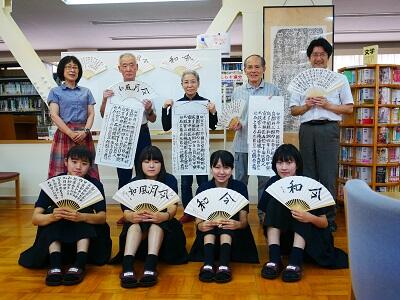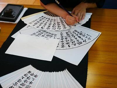 会場の図書館には三碑の拓本が掲げられ、書家としても活動する本校の外処珠美教諭の指導のもと、同教諭が作成した多胡碑文のお手本をもとに、皆さん真剣に文字と向き合い丁寧に筆を進めていた。最後は多胡碑文の中のそれぞれ好きな文字を思い思いに団扇に書写し、記念に持ち帰っていただきました。