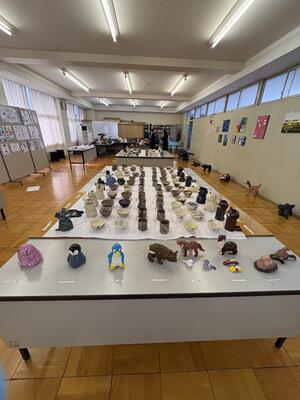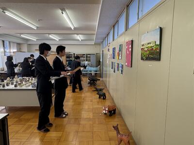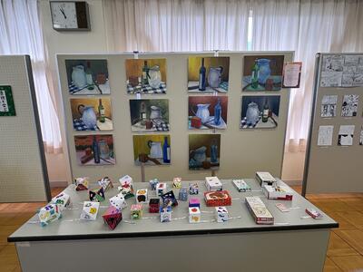 会場では、絵画、デザイン、陶芸、彫刻、書道など、生徒一人ひとりの個性が表れた作品が並びました。先生や生徒に鑑賞してもらい、互いの表現の良さに触れる機会になりました。