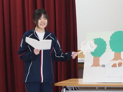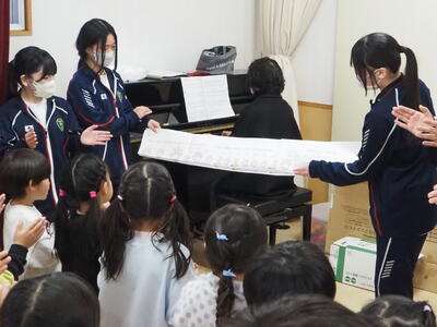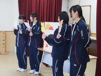 2/9(月)3年生の保育授業選択者が、認定こども園の『吉井めざめこども園』様で、ペープサート(紙人形劇)と音楽リズム遊びを披露させていただきました。