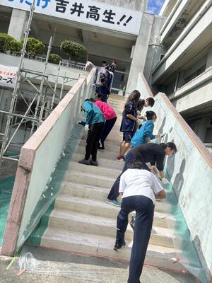 10月18日・19日の二日間にわたり、NPO法人塗魂ペインターズの方々が生徒玄関前の階段を塗装してくださいました。生徒も一緒に参加し、塗装をする大変さを学びながら楽しい思い出を作ることができました。とても立派な階段が仕上がったので10月25日(土)に行われる文化祭でぜひご覧になってください。