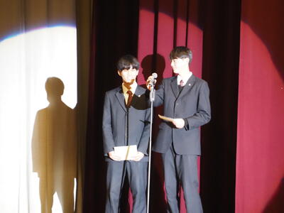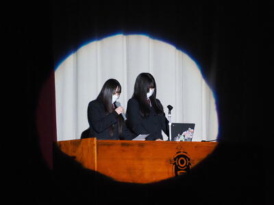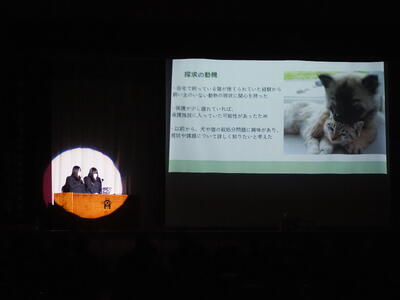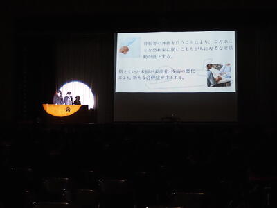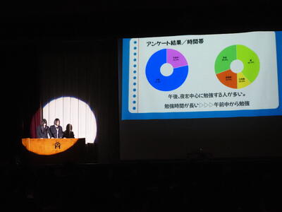 1月21日(水)、3年生が取り組んできた総合学習の研究発表として、学習成果発表会を実施しました。生徒一人ひとりが自ら研究テーマを設定し、課題解決に向けて探究を重ねてきた学習の成果の中から、選ばれた代表者が、全校生徒の前で発表しました。