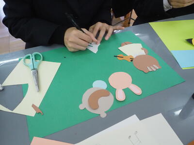 12/5(金)3.4校時、高大連携事業出張授業として、新島学園短期大学の櫻井先生に「造形」の講義をしていただきました。今回は2年保育基礎、3年保育実践受講者が参加しました。保育検定の内容である、こどもの歌から発想を得て、色画用紙で表現する「壁面構成」に挑戦しました。個性豊かなかわいらしい作品がたくさん仕上がりました。