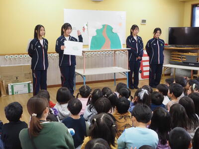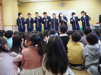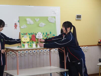 1/23(金)3年生17名が、認定こども園の『ねむの木こどもの森』様で、ペープサート(紙人形劇)実習と身体表現遊びを披露させていただきました。緊張しながらも、子どもたちと一緒に、歌や手遊びで楽しみ、充実した時間を過ごすことができました。貴重な体験をさせていただき、ありがとうございました。